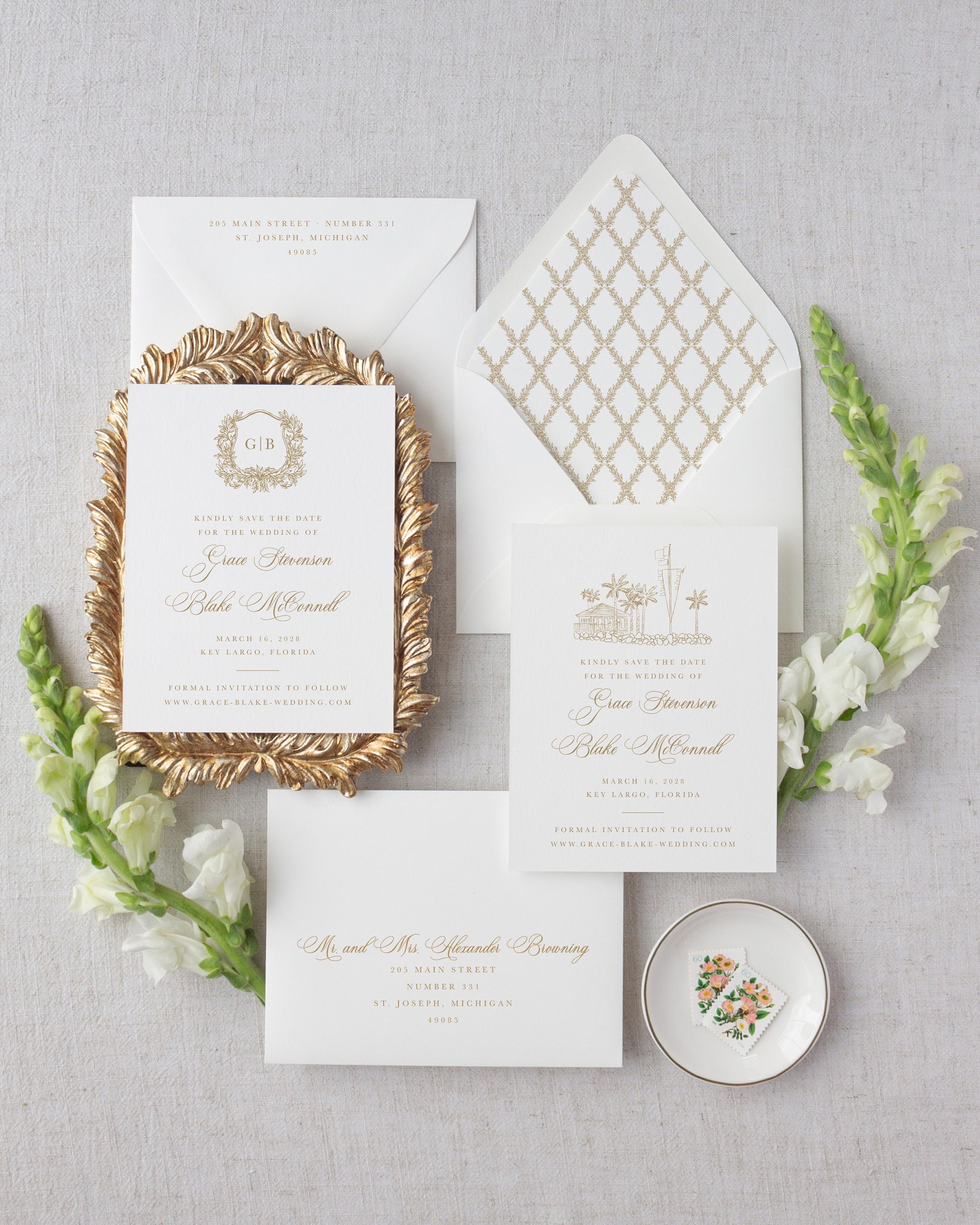 Add embellishments like envelope liners, ribbon, or wax seals to complete your save the date suite.
